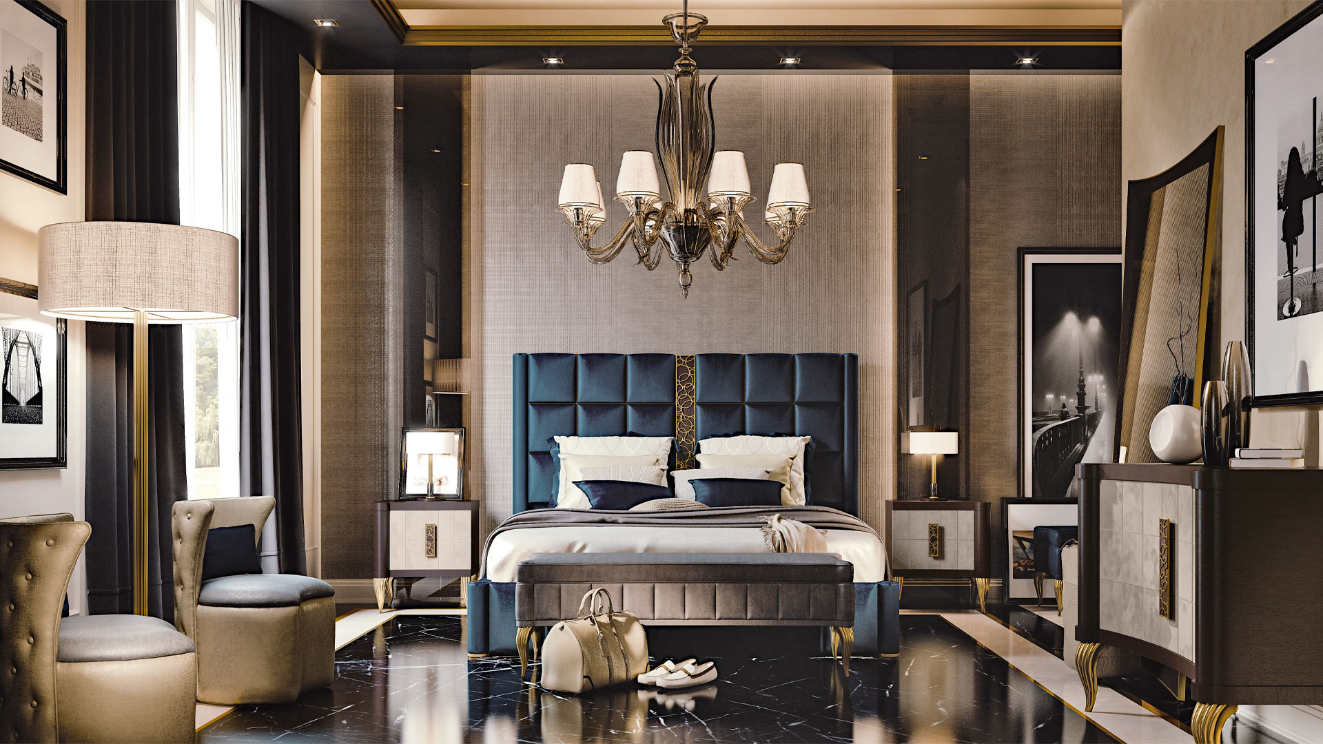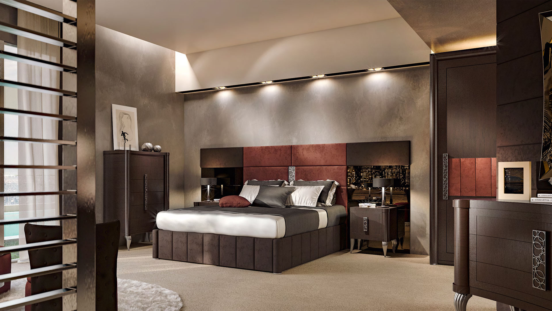 In the bedroom, the Aura collection creates a cosmopolitan and contemporary flavour in every detail: original shapes and geometric decorations, fine and precious materials in a carefully studied interplay of spaces to create a perfect balance, in which each element plays its part and adds harmony to the overall mood of the room.