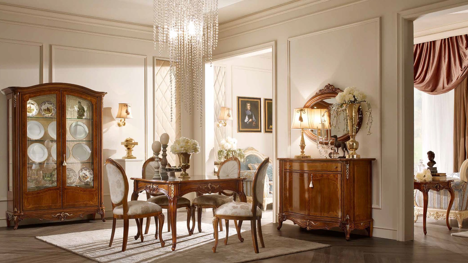 In the living area of the Casa Principe collection, the Baroque relives its unique and sumptuous charm. This noble finesse is evident in the soft, sinuous lines, carved from the finest solid wood, decorated by hand in soft pastel shades, and finished with precious gold leaf and traditional wax antiquing.