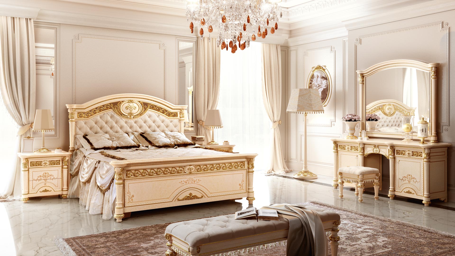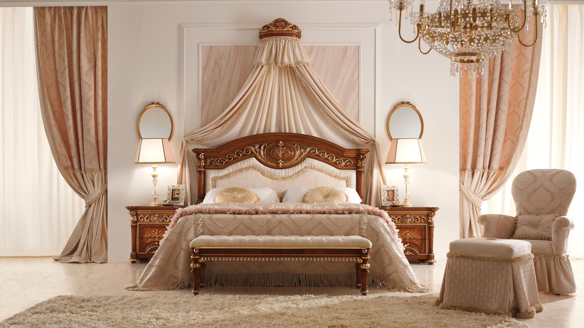 The room becomes a space of sovereign comfort and regal atmosphere. The Greek and Roman civilisations, considered examples of perfection, ethics and aesthetics, inspire the design of furnishing accessories of extreme grace and elegance. In the Louis XVI bedroom, relaxation and rest are a sumptuous and aristocratic affair.
