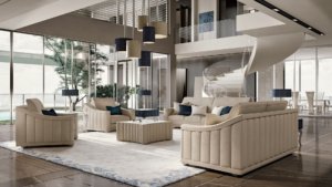 The Dolomite modular wall unit in Zucchero lacquer finish and chrome inserts stands out brightly against the fabric panelling behind. The items of the Aura collection show a contemporary soul with singular shapes that give uniqueness to the living room.
