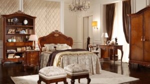 The mirror above has important gold leaf decorations and is complemented by two side wall sconces with mirror, also decorated in gold leaf. The large floor lamp with fabric lampshade stands at the side of the classically styled, elegant and refined bathtub.