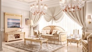 Visual appeal and pure functional design are combined to create a sumptuous and charming living room. The three-seater fabric sofas are positioned opposite each other with an elegant rectangular coffee table lacquered with gold decorations in the centre.