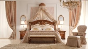The curved Tribeca bedside table with two drawers and curved chest of drawers with three drawers, add a sophisticated touch to the bedroom. The round Fifty pouf with storage echoes the shades of the bed, bringing harmony to the room.